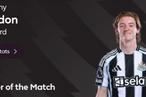 本场比赛纽卡前锋戈登打进全场唯一进球,赛后他也当选英超官方球迷票选全场最佳球员。